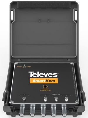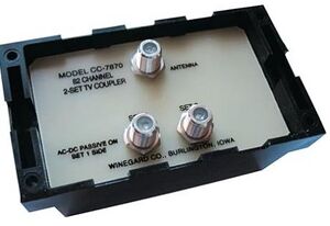 Made by Televes, the SmartKom is a device that can combine up to three TV antennas into one coax. The Smartkom does NOT combine the actual signals from each antenna. Instead, it constantly monitors the signal from each antenna and serves the best signal to your TV tuner in real time. Since the Smartkom serves the strongest signal from only one antenna, multi-path interference is never encountered. The Smartkom unit is commonly used in areas where the TV broadcast towers are in different directions. In the "old days" of over-the-air TV, households would have only one antenna. An electric antenna rotator would rotate the antenna to point toward the TV broadcast tower of interest. The rotator would be controlled from inside the house. When using the Smartkom device, multiple antennas are used. Each antenna is pointed in a different direction, aimed at each of the broadcast tower of interest. The antenna with the strongest signal is automatically sent to the TV tuner.